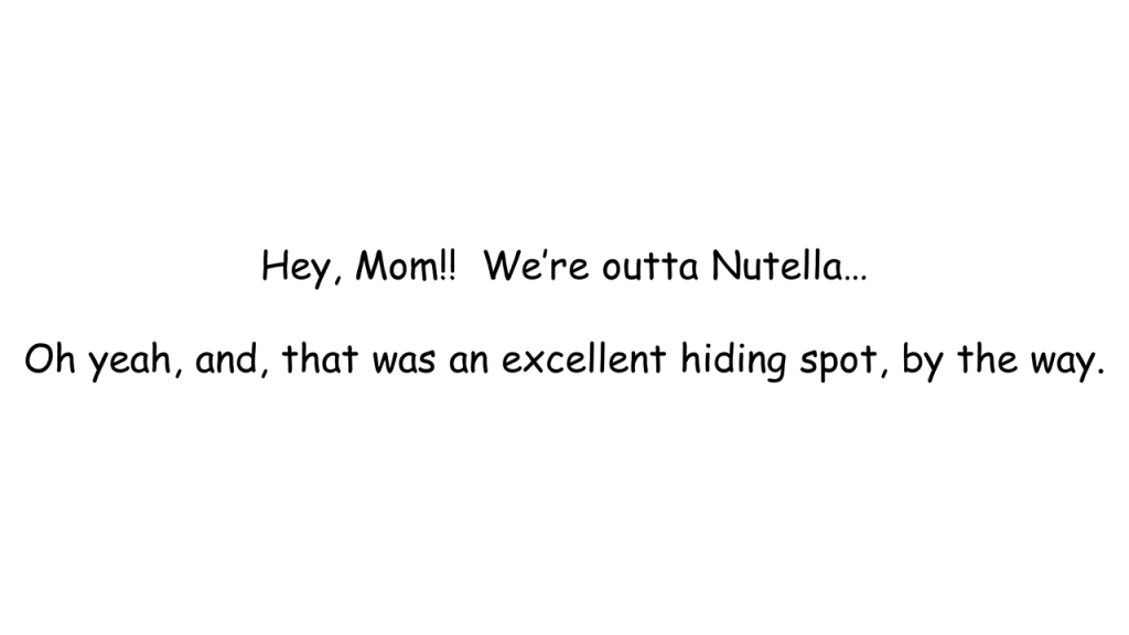 Well, if you couldn’t hear the heavy sigh through the picture, this was a true story. This was at least the third chocolate hazelnut spread jar that we hid in that hiding spot. It was great; it had a good run.