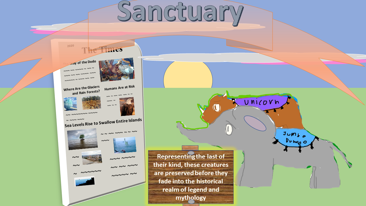 Ah, but that begins to sound political. So, for this lesson, we looked at somethings happening all around us in this changing world. A student and I put this together. We see an elephant and a rhinoceros reading a newspaper with headlines about climate change and extinction. The rhino has a cape labeled unicorn, a name we already associate with a mystical creature that we have no evidence of. This reflects that rhinoceroses have nearly disappeared and they may also been seen as a mythical creature to future generations. Elephants are also nearing extinction due to poaching and loss of habitat. The last image in the primary scene is a newspaper. A physical, printed, paper copy of a newspaper. They, also, have almost left the scene in today’s times. We have fewer and fewer media outlets. There are less voices; almost no local voices. There is no paperboy or girl. Does your town have a newspaper?